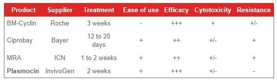 Plasmocin?是一种成熟的抗支原体试剂。它含有两种对支原体有强烈活性的杀菌成分,只能在两周内消除。